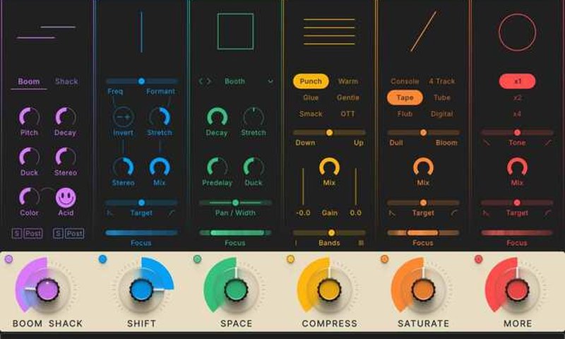 - Focus Filters(フォーカスフィルター)とTarget Sliders(ターゲットスライダー)により、特定の周波数やトランジェント/サステインを独立して操作可能:テール(余韻)だけを歪ませる、あるいは低域をタイトに保ちながら必要な部分にだけ効果を加える、といったことができます。