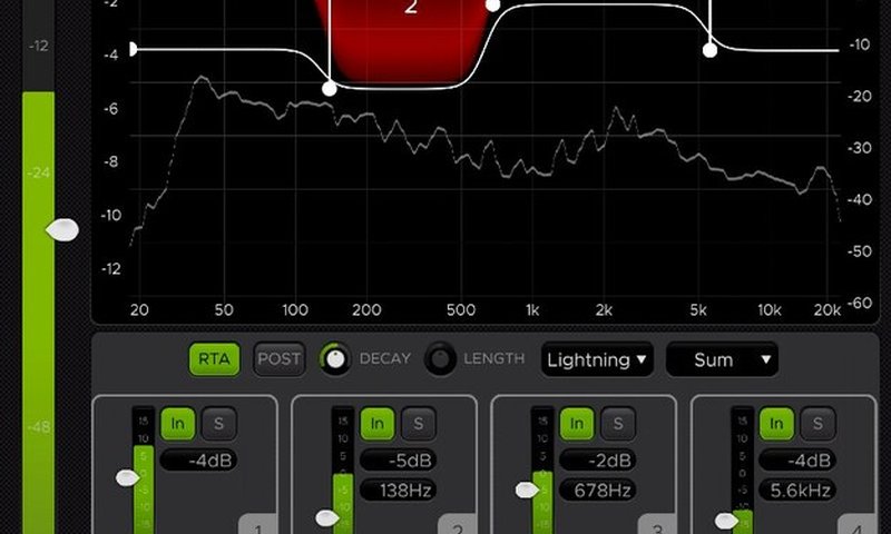 メイン表示には高精度・高速のRTAアナライザー(「スペクトラム・グラフ」または「スクロール・グラフ」)も搭載されており、EQの前(PRE)または後(POST)の表示を切り替えて使用できます。さらにディケイつまみで表示の減衰速度を制御でき、トリムコントロールも備えています。