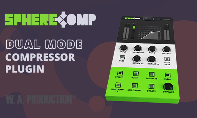 SphereCompはデュアルモードのコンプレッサープラグインで、適切なコンプレッションを手軽に実現するためW.A. Productionが開発しました。誤用でミックスを台無しにし得るコンプレッションを、初心者から熟練者まで扱える設計でフォローし、高価なラック機器や長い習熟時間を要せず同等の結果が得られる点をセールスポイントとしています。